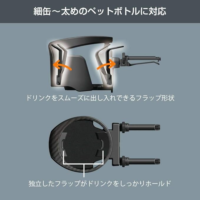 ホールド部の前後2か所にスプリング式のフラップを搭載。十分な可動範囲で、細缶から74mm径のペットボトルまでを幅広く対応。