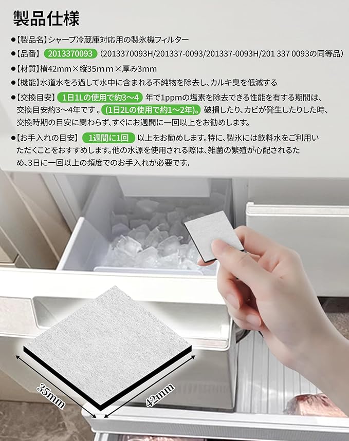 【対応形名】シャープ冷蔵庫対応用の製氷機浄水フィルターです、2013370093H / 201337-0093 / 201337-0093H / 201 337 0093 の同等品)。【サイズ】約35mm 42mm 3mm、【材質】コットンと活性炭、コットンと活性炭を組み合わせた構造で、水道水に含まれるカルキ(塩素)や不純物をしっかり除去し、嫌なにおいのない澄んだ氷が作れます。家庭用としてはもちろん、オフィスの製氷付き冷蔵庫にも最適。氷の質を向上させ、ドリンクの味わいをさらに引き立てます。既存のフィルターと簡単に交換可能で、工具不要の簡単取り付け設計。初心者でも手軽に交換できます。
