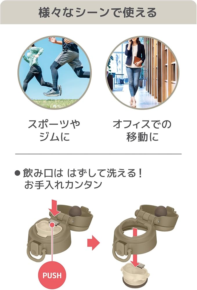 素材・材質:内びん:ステンレス鋼 / 胴部:ステンレス鋼(アクリル樹脂塗装) / ループ・フタ・せん本体:ポリプロピレン / 飲み口:ポリプロピレン / フタパッキン:シリコーンゴム / せんパッキン:シリコーンゴム