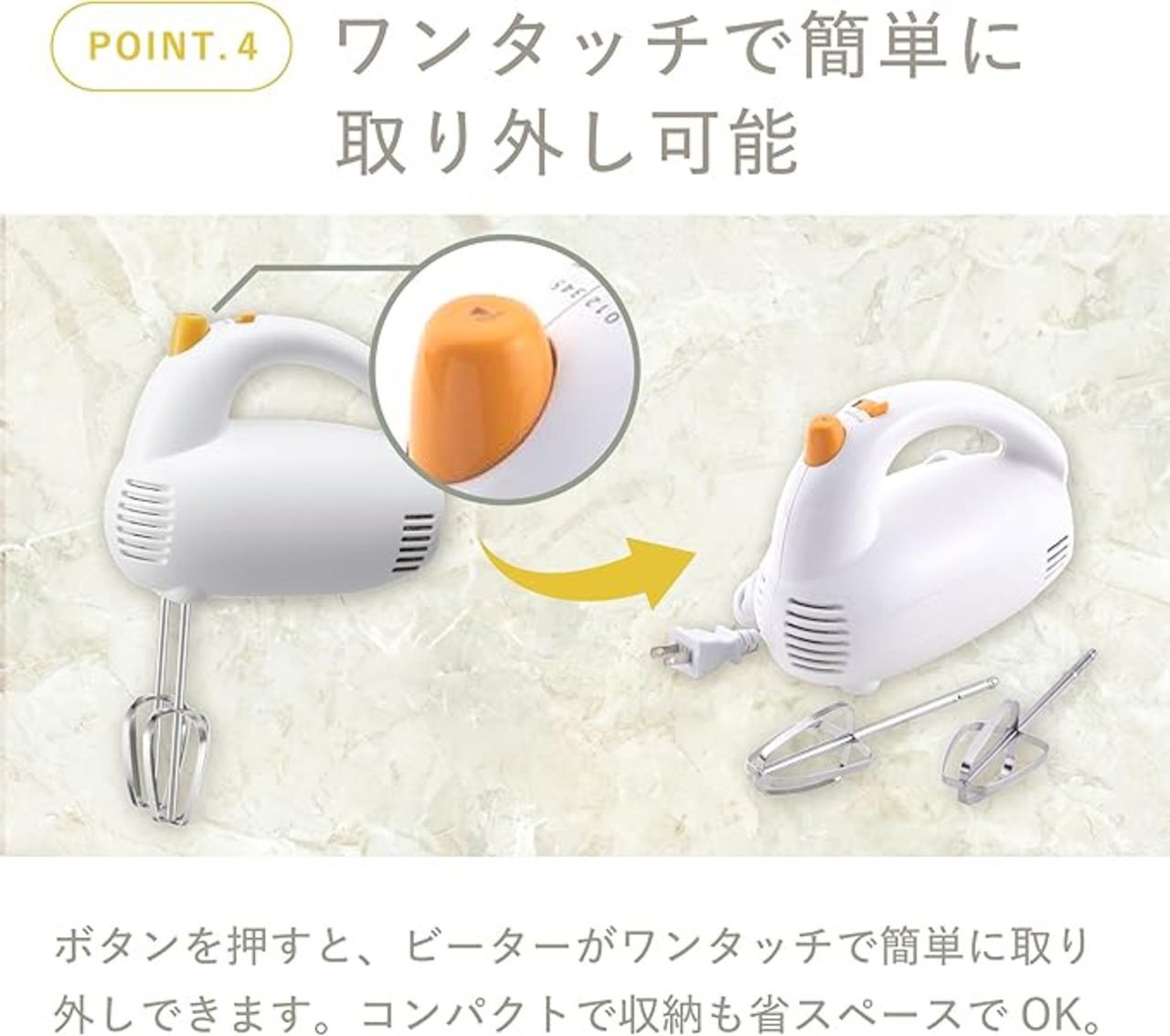 スピードが5段階も切り替えができるうえ、ビーターはワンプッシュで取り外しできる、とても使いやすいアイテム。