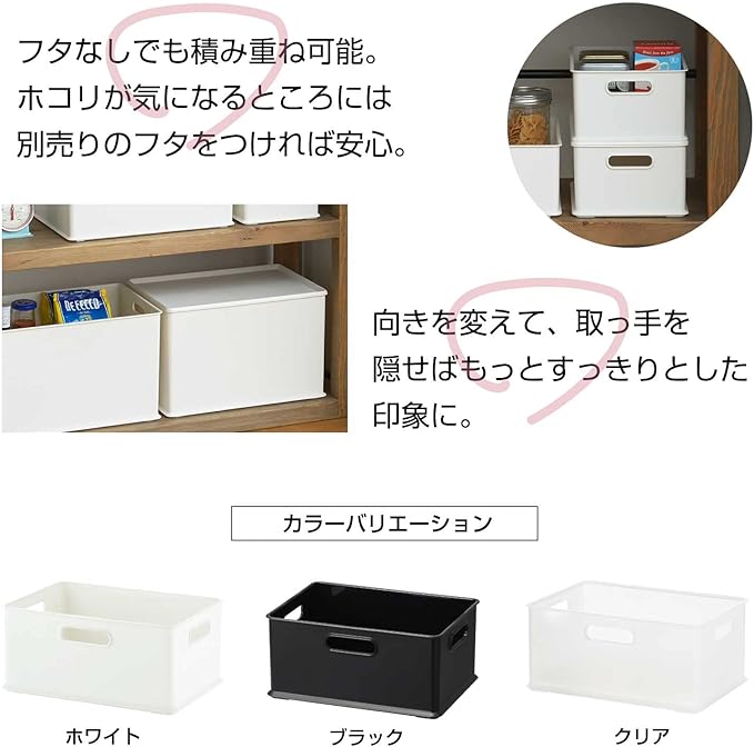 ・どの方向からも取り出しやすい取っ手つき。フタなしでも積み重ねできます。キャスターをつけて、ワゴンのようにも使用できます。(S・SDサイズを除く)