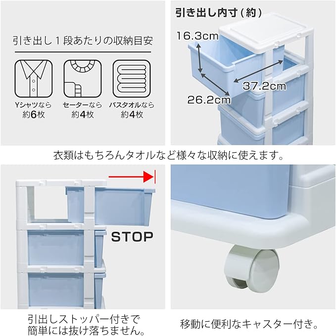 ●1段あたり収納目安=Yシャツなら約6枚、セーターなら約4枚、バスタオルなら約4枚