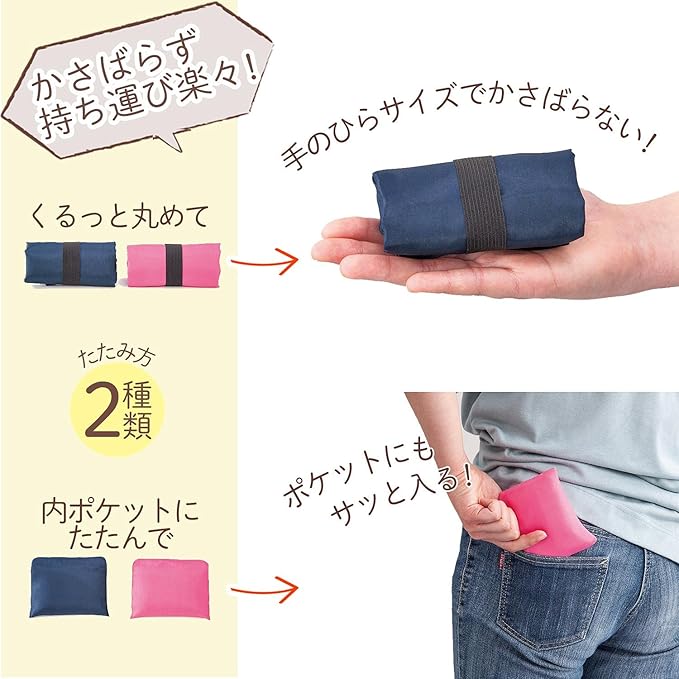 エコバッグは持ち方に合わせてくるっと丸める、内ポケットにたたむの2種類のたたみ方が可能