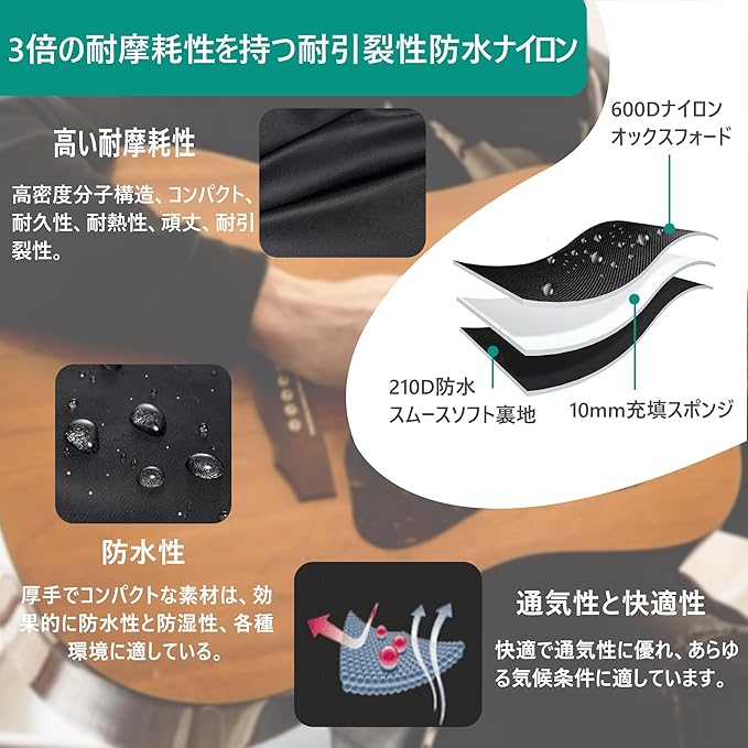 【防水性と耐磨耗性】外部からの水や濡れ、または日常的な使用による損傷からギターを保護するため、このギターケースは防水性と耐磨耗性があります。