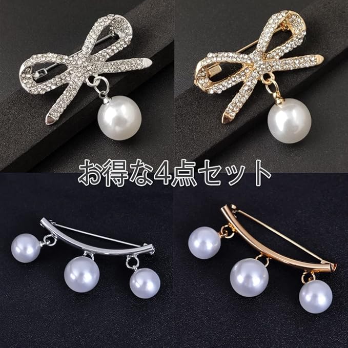 4ピース ブローチピン 襟ピン 人工パール ブローチ ちょう結びパールペンダントブ シンプルカーブパールペンダント レディース アクセサリー 合金 安全ピン 滑り止めピン 卒業式 入学式 結婚式 人気