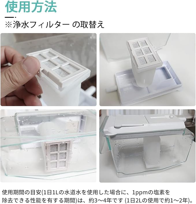 浄水フィルターは定期的にお取替えください。使用期間の目安(1日1Lの水道水を使用した場合に、1ppmの塩素を除去できる性能を有する期間)は、約3~4年です (1日2Lの使用で約1~2年)。