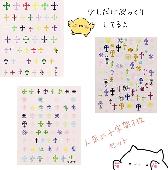 十字架、あしらったネイルパーツ。カラフルでかわいい。ネイルシール3種もセットでコーデ幅アップでお得