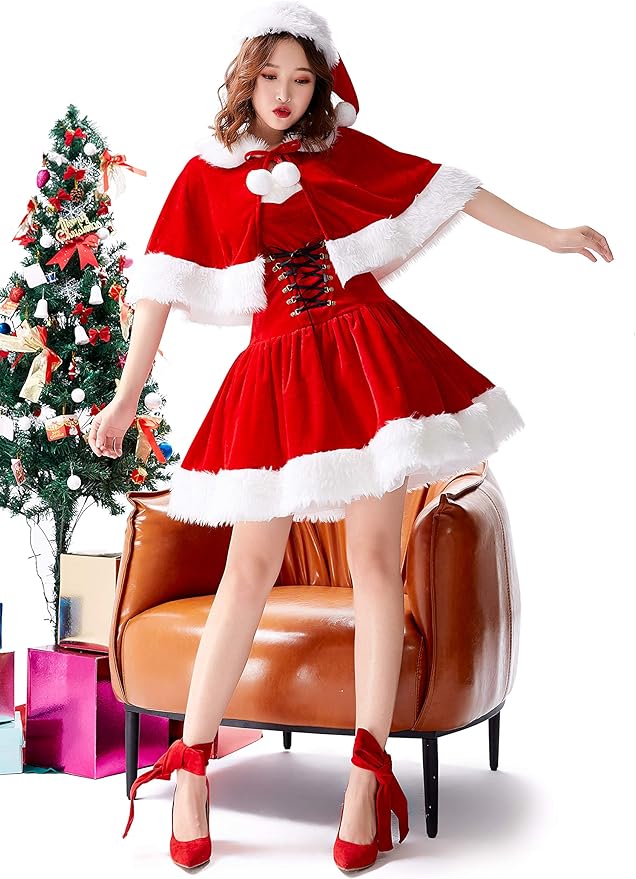 【 おしゃれなデザイン】赤をベースにして、前に紐で編み上げします。裾に白いファーが付いて、ふわふわとした手触りです。細身でキレイなラインを作り出し、脚長と美脚効果があり、女性の魅力をアップします。テーマパークやクリスマスのイベントで、個性を光らせることができます。
