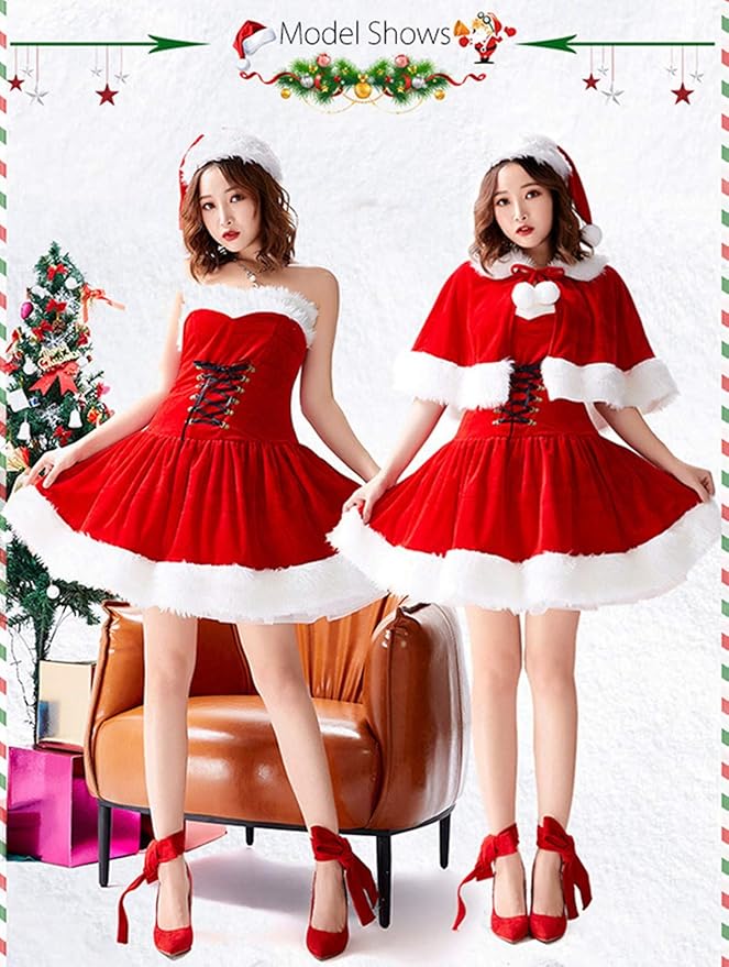 [JUNDOMECY] サンタ コスプレ レディース 可愛い サンタコス 衣装 帽子 ケープ付き 2way クリスマス サンタクロース 仮装 コスチューム 大きいサイズ 演出服 イベント パーティー 舞台 新年会 文化祭 (M)