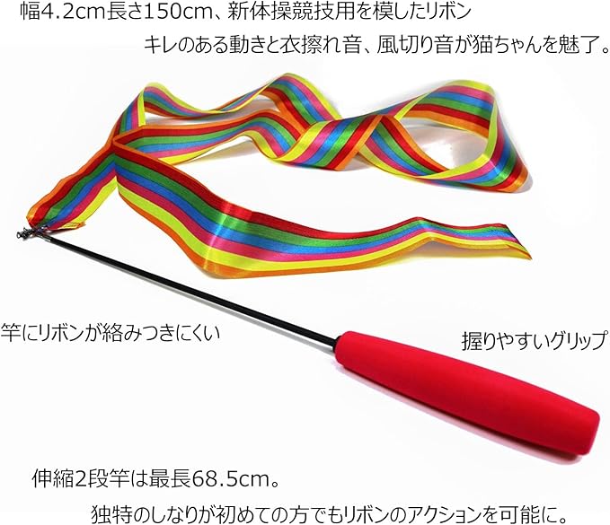 商品紹介 ●新体操で使うリボンのような大胆でビッグな猫じゃらし。●幅42mm長さ1500mmのリボンは適度な硬さで妖しくうねり、こすれたり、風を切る音も相まって猫ちゃんを夢中にする。●伸縮2段式の竿は全長685mm。絶妙なしなりがあり、初心者でも簡単にリボンを操れる。●竿をくるくる回せば「らせん」、小刻みに上下に振れば蛇のような「だけい」、新体操のリボンのように操って猫ちゃんと遊べる。●しっかり動けて猫ちゃんも飼主さんもしっかり運動になるスポーツじゃらしです。 使用方法 【遊び方】●においをかがせたり、目の前で動かしたりして興味を持たせます。●ゆっくり〜素早くなど強弱をつけて動かしてみましょう。
