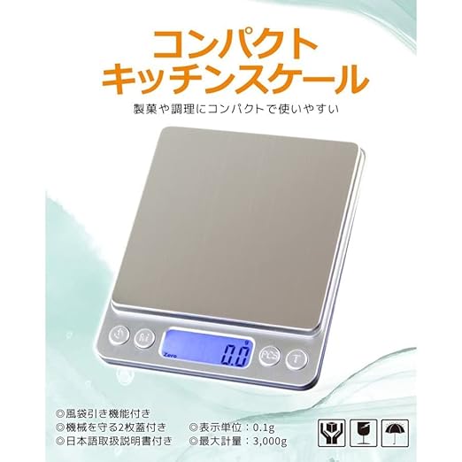 ◆商品仕様◆ デジタルキッチンスケール ■最大計量:3000g ■最小計量:0.1g ■精度の計量範囲: ~750g・・・ 0.2g 751g~3kg・・・ 0.3g ※計測重量に対して上記範囲までの精度を保証します。 ※日本国内の各地域の重量値に若干の誤差が発生することがございます。 ■計量単位:0.1g ■サイズ:109mm 縦130 高さ20mm ■重さ:約275g ■付帯機能:風袋引き機能、カウンティング機能、自動電源オフ機能 ■付属品:スケール本体・大小透明カバー(計量皿との併用可) 単四電池2個、日本語取扱説明書* ■安心の6月保証 ■製品企画国:日本 ■製造国:中国 ※カバーには、保護フィルムがついておりますので、ご使用の際は剥がしてからお使いください。 ※本品はご家庭用です。品物の売買取引や公に目方を証明する場合などには使用しないでください。