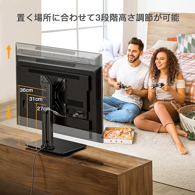 【簡単に高さ調節&左右首振り】PERLEGEAR テレビスタンド ロータイプは、取り付け部中心から台座まで、高さがそれぞれ29cm、34cm、38cmに調整できます。また、力不要でテレビの端を振りだけで左右それぞれ45 首振りが可能です。
