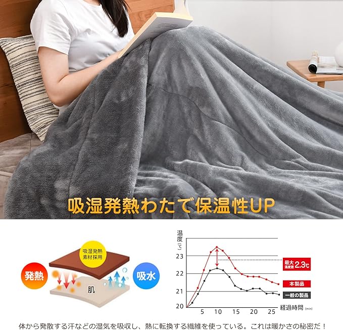 【あったか三層構造】2枚の毛布を合わせて吸湿発熱中綿をたっぷりいれて、体から発散する汗などの湿気を吸収し、熱に変換する繊維を使っている毛布なので、暖かい空気を毛布に閉じ込め、保温力がさらにアップする。