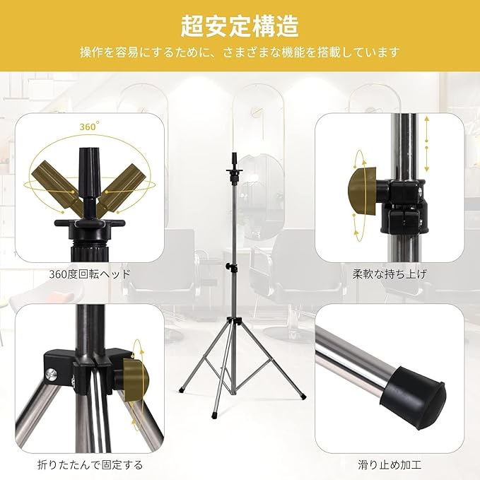 【信頼の安定性】高強度で耐久性に優れたアルミニウム合金製。三脚式設計と回転可能なヘッドで、さまざまな重量のマネキンヘッドを安定支持。高さは自由に調節可能(77.5~120cm)、立ってや座っての練習にも対応。美容練習やメイク作業に最適です。