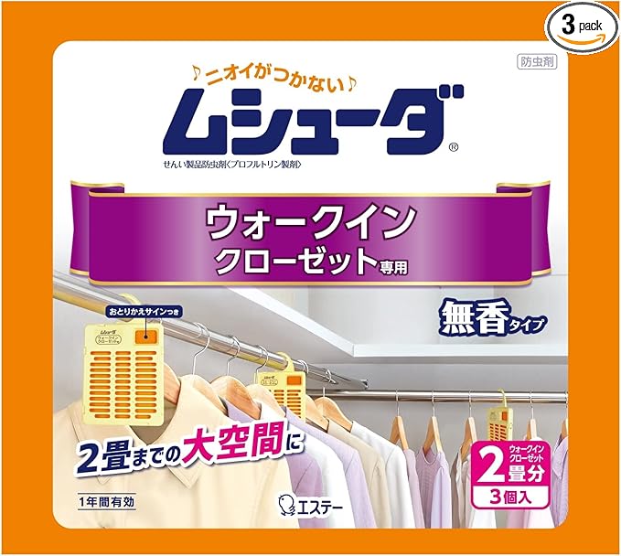 <大切な衣類をしっかり防虫> 防虫成分が約1年間安定した効果を発揮し大切な衣類を虫から守ります。 カシミヤ・ウールにも安心してご使用いただけます。 <2畳までのウォークインクローゼットに対応> <衣類にニオイがつきません> 防虫剤のニオイが衣類に移りませんので、ウォークインクローゼットから取り出してすぐ着られます。 <取り替え時期がわかります> おとりかえサインの窓に「おわり」の文字がはっきり出たら、新しいムシューダにお取り替えください。