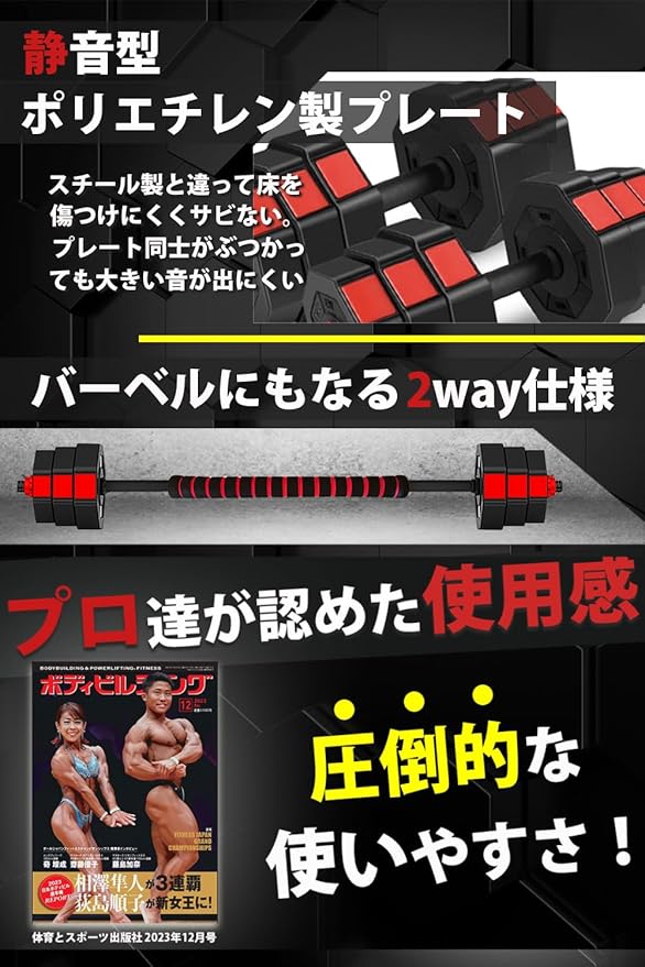 数々の通販サイトの ダンベル ランキング1位を総ナメ バーベル にできたり 重さの調整が可能という広い拡張性と洗練されたデザインによって、ネット通販だけでなくリアル店舗の販売ランキングも席巻中。高価な スチールやアイロン製 にも負けない耐久性を確保