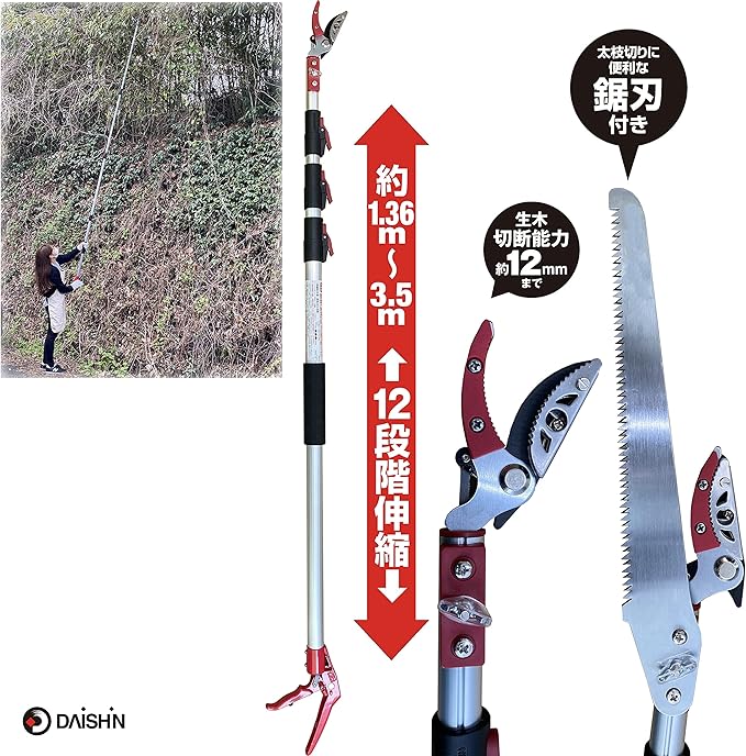 DAISHIN 収納に便利な伸縮式高枝切鋏 3.5m /4段式伸縮タイプ 高枝切りはさみ 大進 高枝切りバサミ 剪定鋏 高枝 はさみ 高枝切狭 枝きりばさみ 剪定 高枝切り 伸縮 はさみ 剪定鋏 ガーデニング用品 枝切 ハサミ 園芸用品 庭園 軽量鋏 女性用 軽い 高枝切鋏