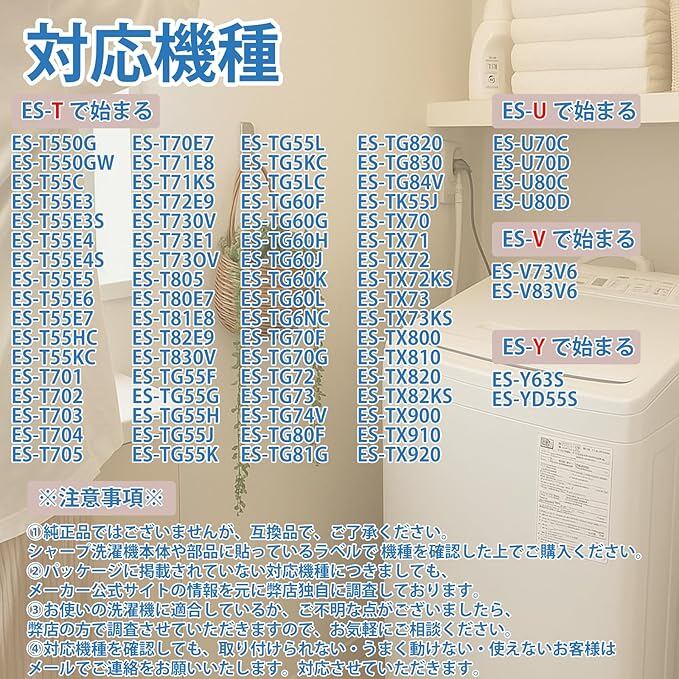【注意事項】①純正品ではございませんが、互換品で、ご了承ください。 シャープ洗濯機本体や部品に貼っているラベルで 機種を確認した上でご購入ください。②パッケージに掲載されていない対応機種につきましても、HOT公式サイトの情報を元に弊店独自に調査しております。③お使いの洗濯機に適合しているか、ご不明な点がございましたら、弊店の方で調査させていただきますので、お気軽にご相談ください。④対応機種を確認しても、取り付けられない・うまく動けない・使えないお客様はメールでご連絡をお願いいたします。対応させていただきます。⑤生産ロットの違いによって、色や形が若干異なる場合がございますので予めご了承下さい。モニターの発色の具合によって実際のものと色が異なる場合がございますが、ご了承くださいますようお願い申し上げます。