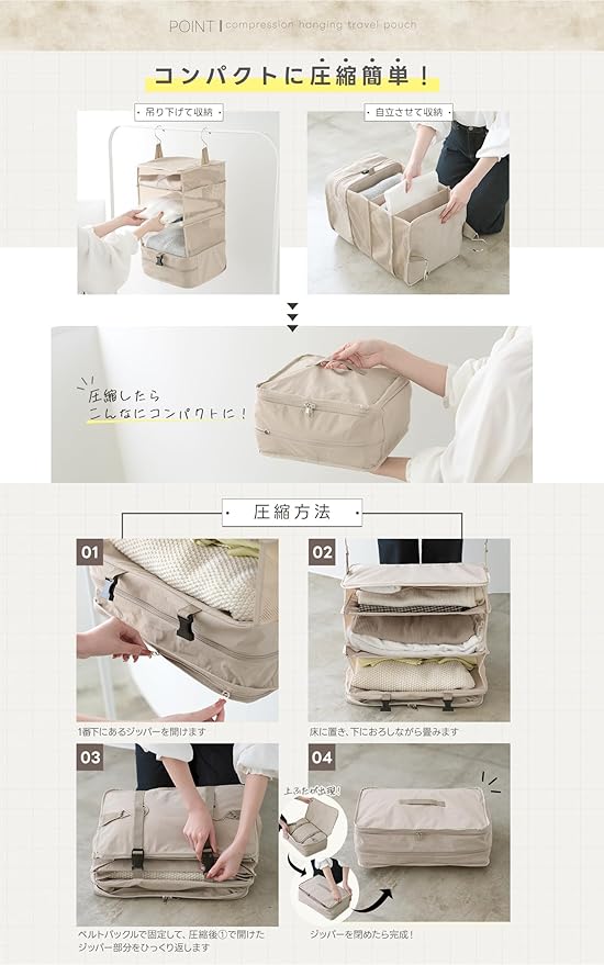【吊り下げ収納&コンパクト圧縮の2WAY仕様】 クローゼットやハンガーラックに吊り下げて使える収納ポーチ。使用後は圧縮してコンパクトに折りたたみ可能。旅行時は荷物をスッキリ整理でき、自宅では衣類の整理整頓に活用できる多機能設計です。