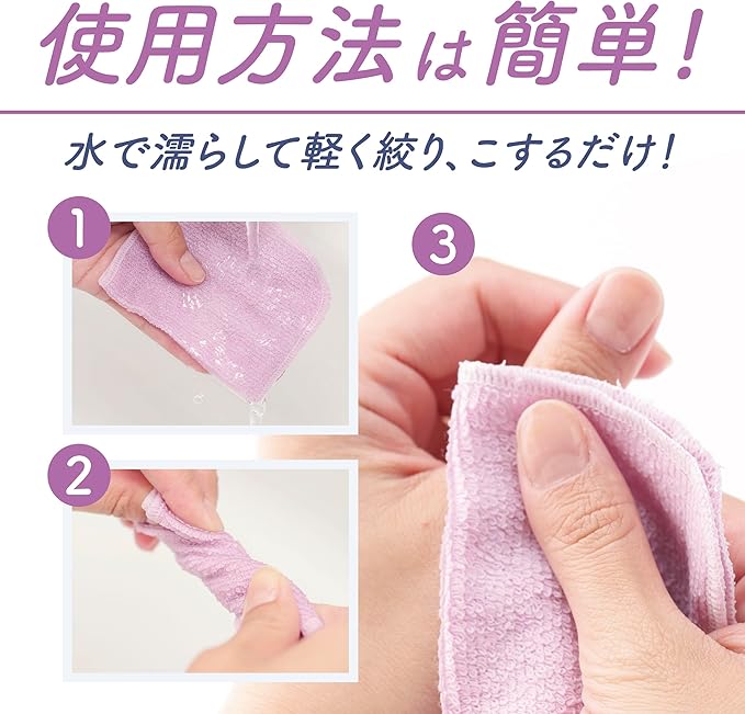 【使用方法】 ①よくほぐす、最初は固く感じますが、ぬるま湯でほぐすと柔らかくなります。 ②なでるように拭く。水分をたっぷり含ませてなでるように拭いてください。 ③使用後よく洗って乾かしてください。定期的に石鹸等で手洗いをしてください。
