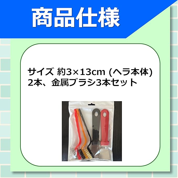 【 金属ブラシ付きで細かい部分も徹底掃除 】 セットに含まれる金属ブラシで、ヘラでは届きにくい細かい部分の汚れも徹底除去。隙間や溝、凹凸のある部分の汚れも逃さずピカピカに!