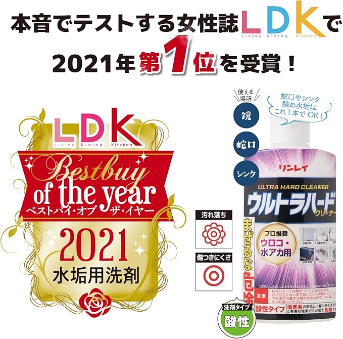 〈使えないもの〉曇り止め加工等の特殊加工された鏡、ガラス以外の鏡、すりガラス、 樹脂製の浴そう・浴室床・浴室壁、樹脂製の便器、フッ素・樹脂加工面、塗装面、 プラスチック製品、木製品、石材(人工大理石を含む)、光沢のあるステンレス製品、 漆器、銅・アルミ等の柔らかい金属、金銀等の貴金属製品、金銀等の線模様入り 陶磁器、自動車、水がしみ込む物 ※必ずゴム手袋等の保護具を着用してください。①内容液が分離する場合があるので、よく振ってください。②汚れに直接かけるか、キッチンペーパーや布、スポンジ(過度に柔らかい道具を使うと、本来の洗浄力が得られない場合があります)等に含ませ、こすり洗いします。③洗剤成分が残らないように、充分に水で洗い流すか水拭きします。※ひどい汚れには、厚めに塗り広げて1~2分置いた後、こすり洗いすると効果的です。それでも汚れが残る場合は同じ作業を繰り返してください。※材質によっては傷がつくことがあるので、必ず目立たない所で試してからお使いください。※内容液が分離しても品質には問題ありません。※汚れの程度によって落ちないものもあります。 続きを見る