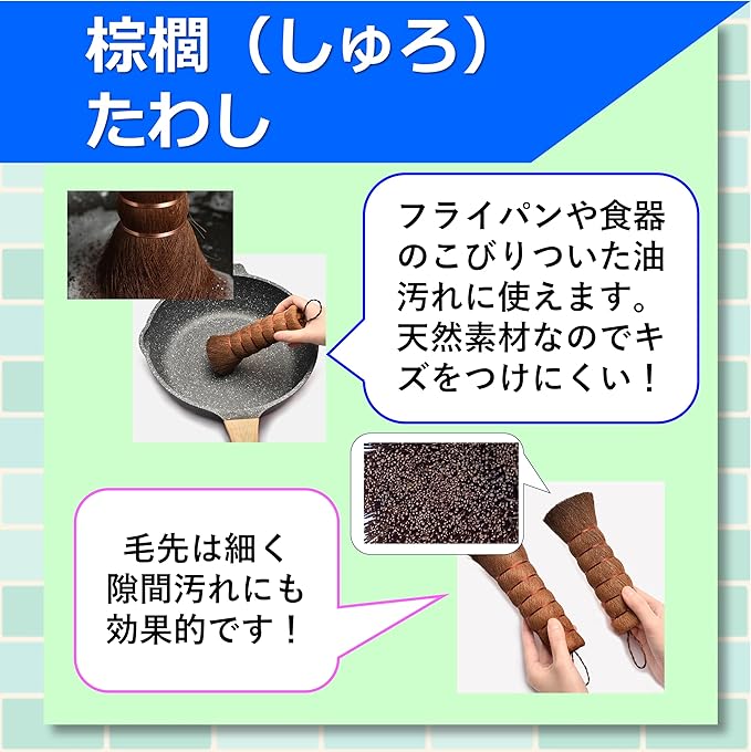 【 頑固な焦げ付きもスッキリ落とす 】 フライパンや鍋、中華鍋の焦げ付き、キッチンの油汚れも、しゅろたわしなら力強くこすり落とせます。天然シュロ繊維ならではのコシの強さで、しつこい汚れにも対応。シンク掃除やコンロ周りのクリーニングにも幅広く使えます。キッチンブラシとしても優秀な一品です!