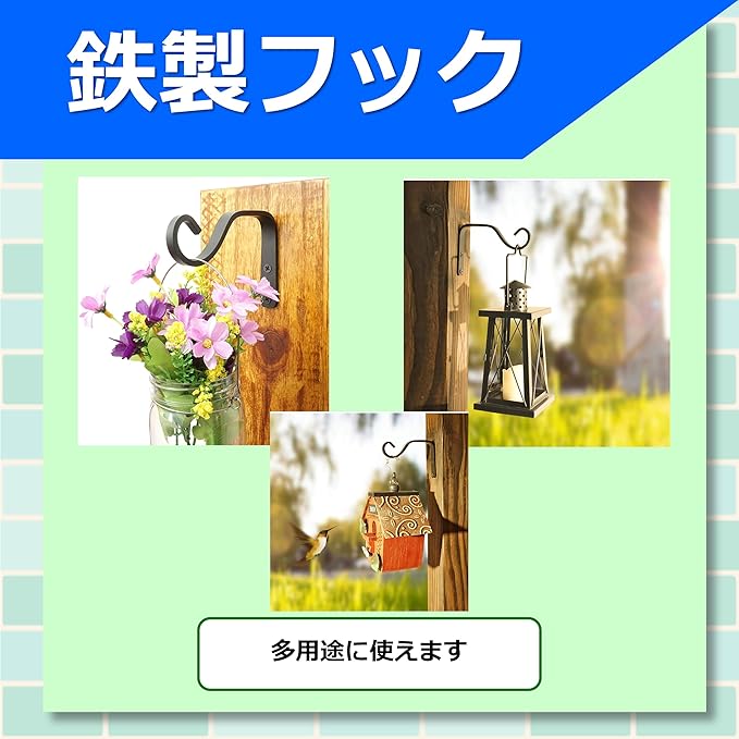 【 錆びに強い高耐久性の鉄製フック 】 このプラントブラケットは、錆びにくい特別なコーティングが施されており、耐候性に優れた丈夫な鉄製です。風雨や紫外線にも強く、長期間使用しても劣化しにくいため、屋外でも安心して使用できます。フラワーバスケットやランタンも、しっかりと支える安定した作りで、強度と耐久性にこだわった設計です。