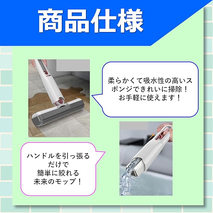 【 手洗い不要!簡単お手入れ 】 モップ部分は取り外して水洗いが可能で、汚れが気になる場合でも手を汚さず清潔をキープ。吸水性の高いスポンジ素材を使用し、水分や汚れをしっかりキャッチ。水拭き後もサッと乾燥するので、繰り返し快適にお使いいただけます。お掃除の効率が大幅アップする便利アイテムです!