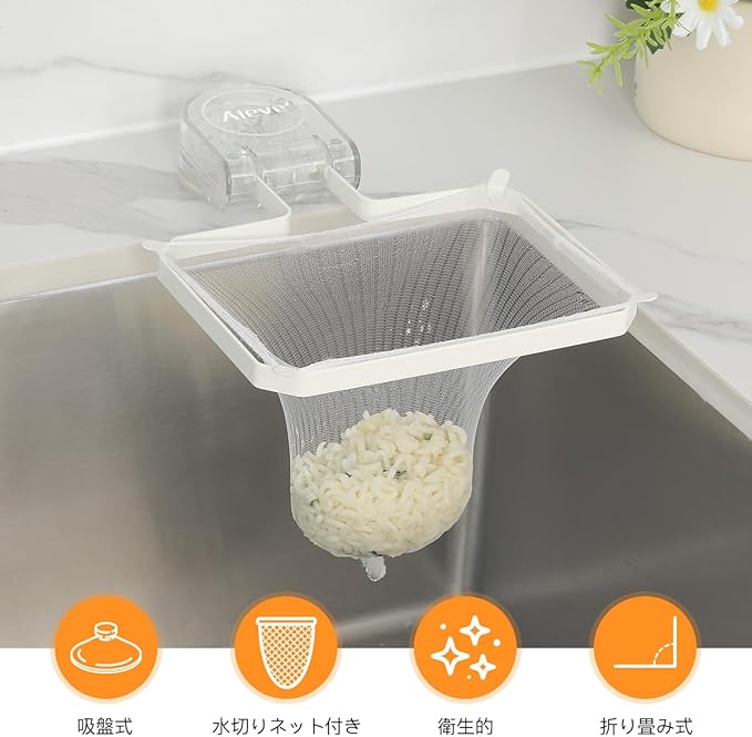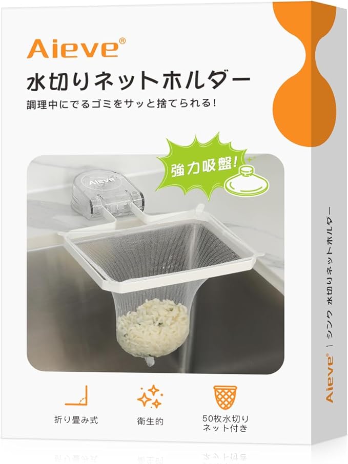Aieve 三角コーナー いらず 強力吸盤 水切りネットホルダー サンカクコーナー シンク ゴミ受け 生ゴミ入れ 粘着吸盤 折り畳み 省スペース 浮かせる キッチン シンク 台所 水切りネット50枚付き ホワイト