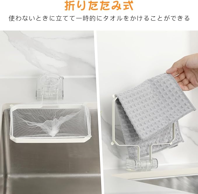 【折り畳み式】サンカクコーナー 水切りネットホルダーは折りたたみ可能なデザインで、使わないときに立てられるため、シンク内のスペースを取らず、一時的にタオルをかけることができるなど、シンクのスペースを最大限に活用しています。