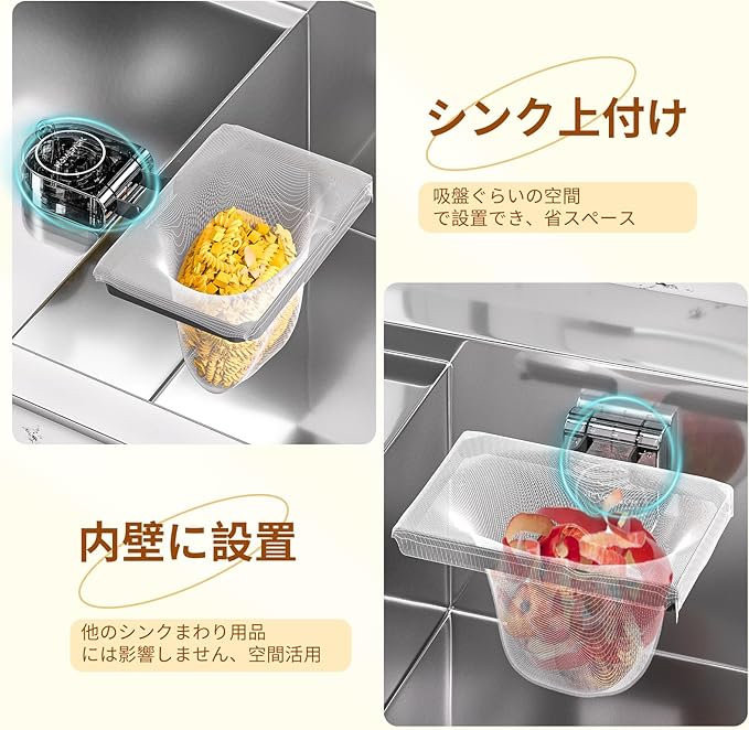 【スペース節約】:コンパクトでスリムなデザインにより、キッチンのスペースを有効に活用できます。シンクの縁や内壁に簡単に取り付けられるため、作業スペースを広く保つことができます。