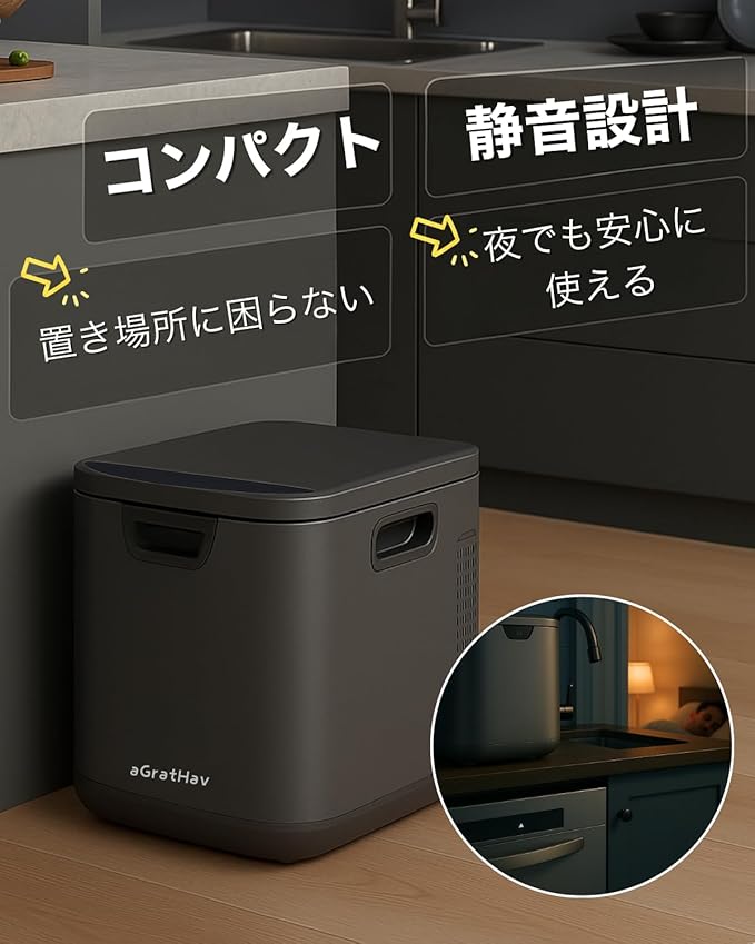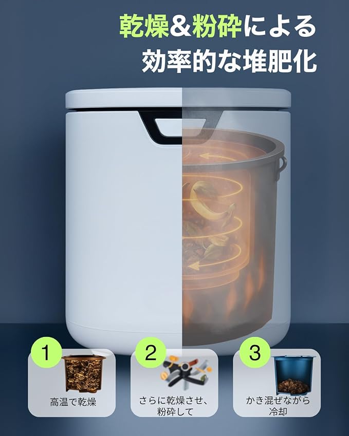 【80%生ごみ削減処理】:aGratHav生ごみ処理機は、たった3.5時間で生ごみを80%削減。高温乾燥・粉砕・冷却処理により、野菜くず、果物くずだけでなく、肉類と魚類も処理できます。忙しいキッチンでも素早く効果的な堆肥化を実現。より緑豊かで清潔な地球づくりに貢献しましょう。