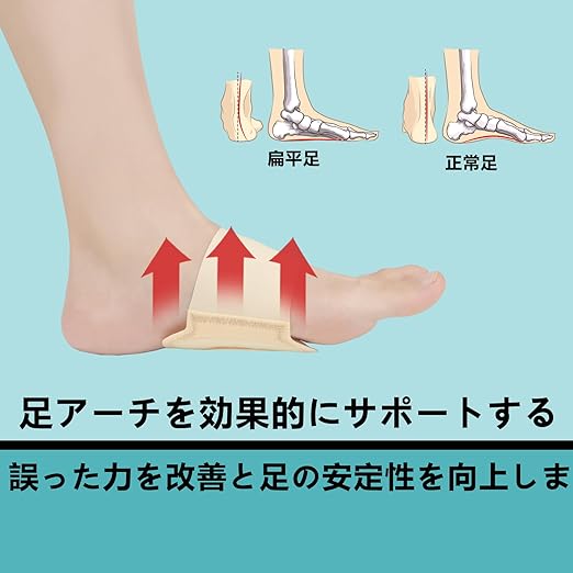 扁平足サポーター:運動神経のない扁平足の方におすすめのサポーターです。足のアーチを適切にサポートし、歩行時の負担を軽減。正しい姿勢を保ちながら、快適な動きを実現します。