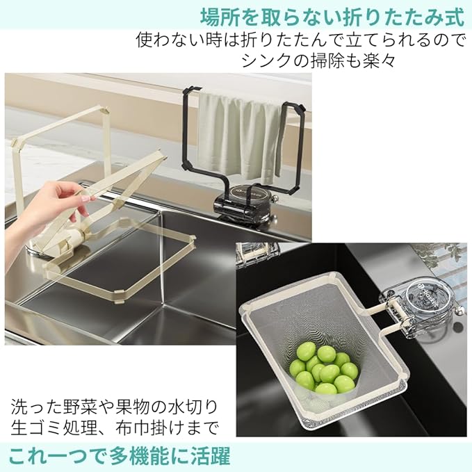 【折りたたみ式でキッチンをもっと広く、もっと便利に!】場所を取らない折りたたみ式!使わない時は折りたたんで立てられるので、シンクの掃除も楽々。生ゴミ処理としてはもちろん、布巾掛け、洗った野菜や果物を置く水切りかごとしても使え、キッチンを広く活用できます。