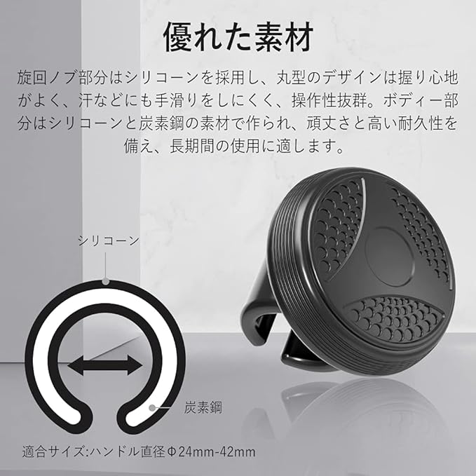 【製品仕様】素材:シリコーン+炭素鋼、カラー:ブラック、グリップ部分サイズ:直径58mm、 適合サイズ:ハンドル直径Φ24mm-42mm。