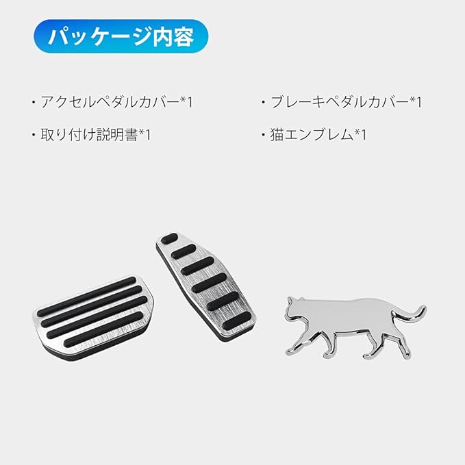 取り付け方法:説明書付き、工具不要でワンタッチで取り付け可能。アクセルペダルは被せるように装着し、ブレーキペダルは既存のゴムペダルを取り外して付け替えます。