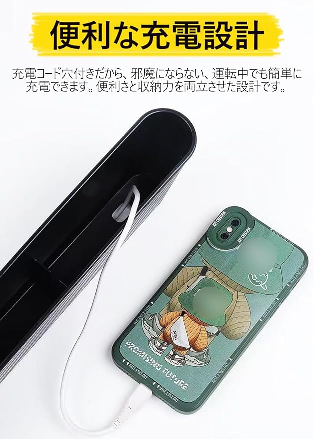 【充電ポート付きシートクッション】スマホや小物を収納しながら、シートクッションに内蔵された充電ポートで、運転中でも簡単に充電できます。便利さと収納力を両立させた設計です。