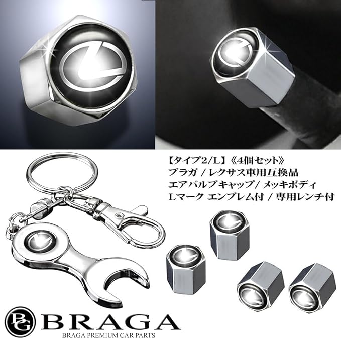 LS GS IS ES RX LX NX UX HS CT RC LC レクサス車用 メッキボディ エア バルブ キャップ タイプ2/L Lマーク エンブレム付4個セット 専用レンチ付 客注品 欧米仕様
