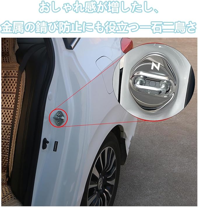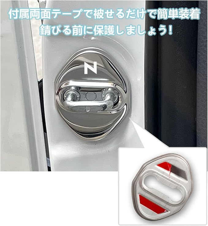 ホンダ専用 N-BOX/N-BOXカスタム JF3、4系 N-ONE JG3、4系 N-VAN/N-VANスタイル JJ1、2系 N-WGN/N-WGNカスタム JH3、4系 に適合 ドアストライカーカバー専用 ドアロックカバー ステンレスカバー 簡単取り付け メタリック 4個セット