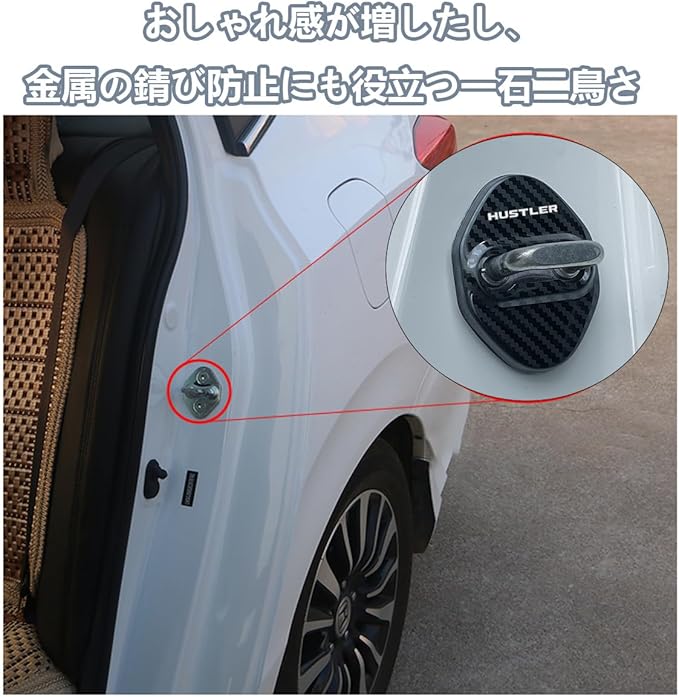 スズキに適用 新型ハスラー(HUSTLER) /MR92S MR52S MR02系(2020年1月~) MR31S MR41S に適合 ドアストライカーカバー専用 ドアロック ステンレスカバー 簡単取り付け メタリック 4個セット