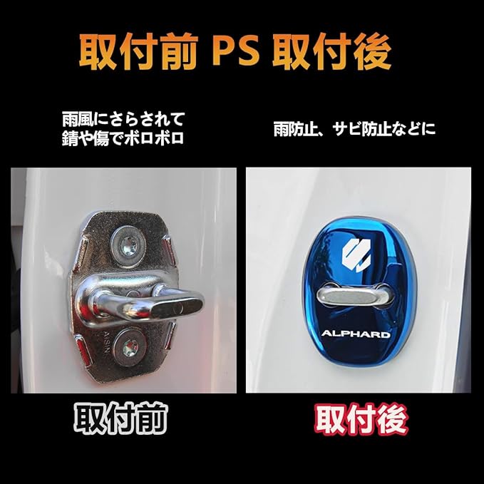 トヨタに適用アルファード専用 ALPHARD AGH40W AGH45W 40系(2023年6月~) 20系 30系に適合 ドアストライカーカバー専用 ドアロックカバー ステンレスカバー 簡単取り付け メタリック 4個セット(BULE-青色)