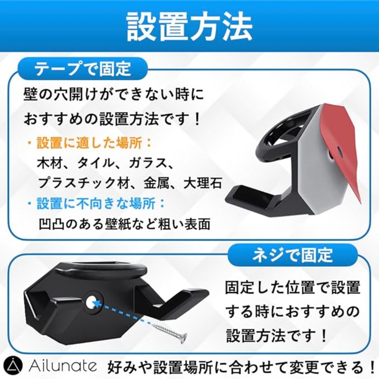 ✅【設置方法】付属のテープやネジを使って帽子ホルダーを壁に取り付けることができます。賃貸物件など壁に穴を開けることができない時に付属のテープで帽子ホルダーを固定できます。設置に適した場所:つるっとした素材(木材、タイル、ガラス、プラスチック材、金属、大理石)。凹凸のある壁紙や粗い表面ではテープが剥がれやすいため、つるっとした扉や壁に貼り付けて設置してください。吊り下げ位置が決まっている時やしっかり固定したい時は付属のネジを使い、帽子ホルダーを設置してください。