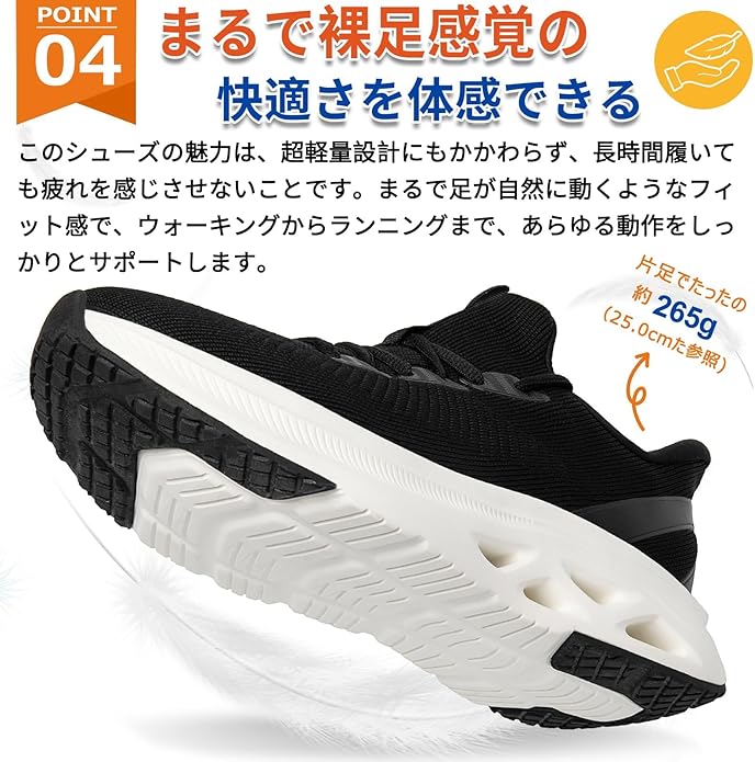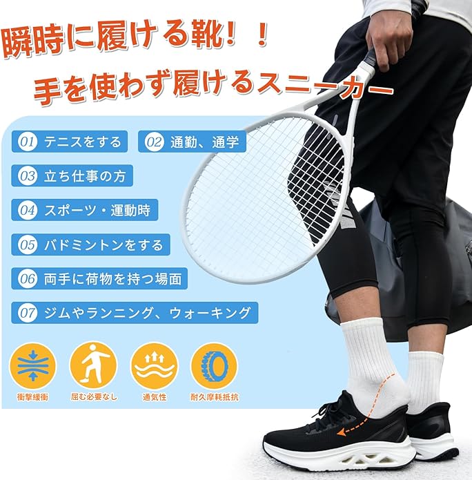 【立ったまま簡単に履ける設計(手を使わず、靴ベラいらず)】「かかと部分の傾斜でップ+自動調節ひも」で、一度調整すれば着脱時に手を使わずに完了。忙しい朝や外出前の準備がとても楽になります。通勤や買い物、旅行に最適で、頻繁に靴を脱ぎ履きする方にも便利です。特に高齢者の散歩にもぴったり。母の日や父の日の贈り物にもおすすめ。通学靴やスポーツシューズとしても活躍します。