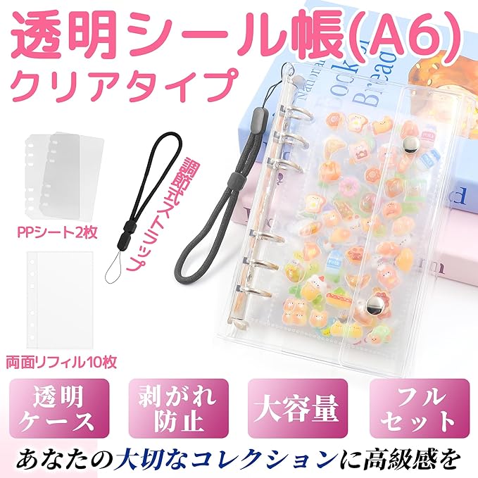シール帳 透明 A6サイズ はがせる 女の子 シールバインダー シール手帳 クリアバインダー 6穴 シール収納 推し活グッズ シール台紙10枚セット 3層構造 PPシート2枚&専用ストラップ付き(透明)