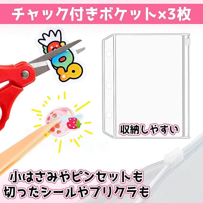 【豊富なアクセサリーで整理収納】シール帳用チャック付きボケット 3枚:細かいシール破片や文房具を確実に収納。女の子のシール整理をしっかりサポート。PPシート 3枚:表面はザラザラしていて、シールがべったり付かずに、剥がしやすい!はがせるシールの仮置きやレイアウト確認に最適なシール台紙として活用可能。専用ストラップ:かわいいミニシール帳として携帯できるシール手帳に。透明しーる帳のデザイン性を引き立てます。