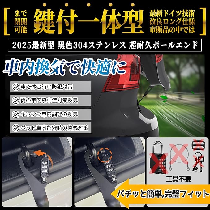 車用ドアストッパー リアゲートストッパー [ロック可能] 車中泊・車内換気専用 鍵一体型 車用ドアロック 半開保持 工具不要 3秒設置 ダイヤルロック内蔵 傷防止設計 ステンレス鋼 収納ボックス+セットピン+説明書付属 ブラック
