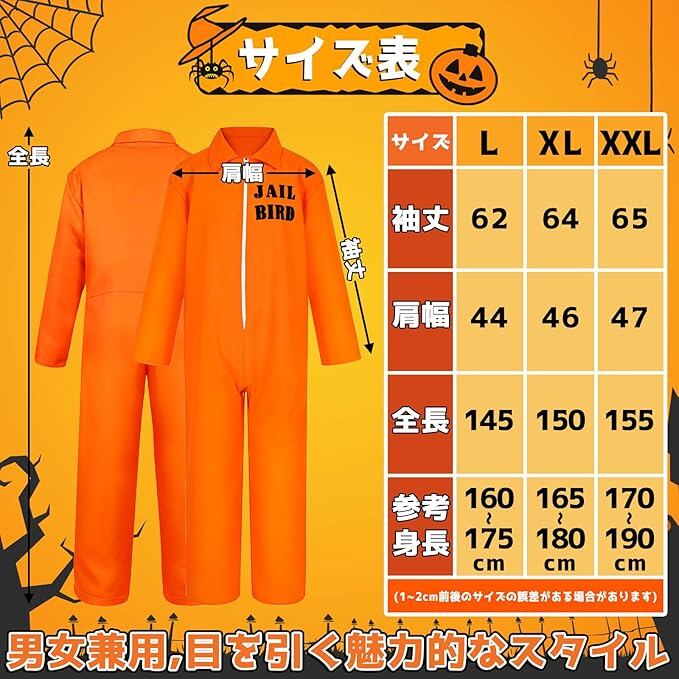 【4点セット-サイズ】- 囚人服トップス+タトゥーシール3枚。肩幅44cm, 袖丈62cm, 着丈145cm,適応身長160-175cm。ストレッチが効いていて着心地が良く、伸縮性があるため、イベントでの動きも楽です。囚人服 コスプレ オレンジ-これ一枚でコスプレが完成するため、届いてすぐにイベントに参加できます 露出が少なく、コスプレ初心者にも好評です。