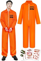 【囚人服コスプレ】- タトゥーシールが付いているため、ハロウィンの雰囲気が抜群です。本格的な囚人のルックが楽しめ、グループで着用しても雰囲気が良いかもしれません。友達と一緒なら一体感が出て、より楽しめます。