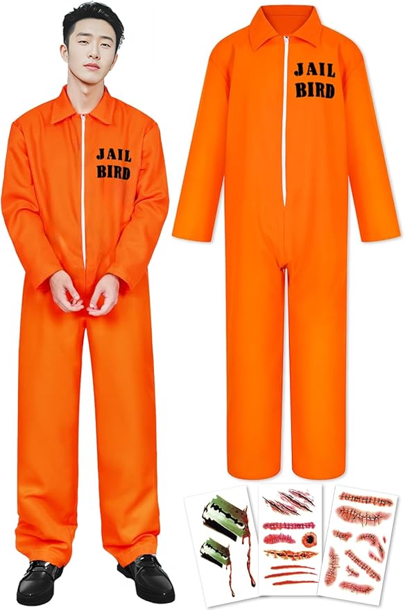 [COZENRE] 囚人服オレンジ 4点セット コスプレ メンズ ハロウィン コスチューム 囚人 コスチューム つなぎ 仮装 ユニセックス 長袖 傷シール タトゥーシール付き
